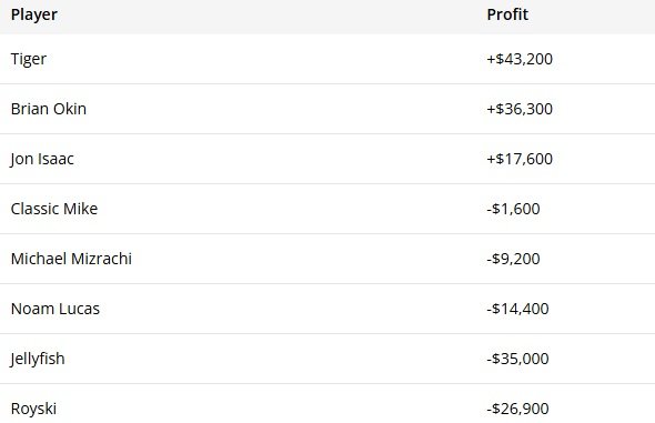 Η συνέχεια όμως δεν ήταν εξίσου ευνοϊκή για τον Jellyfish. Παρά το δεύτερο μεγάλο pot που κέρδισε με flush, η βραδιά τον βρήκε τελικά στο –$35.000, ενώ ο Mizrachi περιορίστηκε σε μικρή απώλεια περίπου –$9.200. Ο μεγάλος κερδισμένος του session ήταν ο Tiger, που έκλεισε με +$43.200.