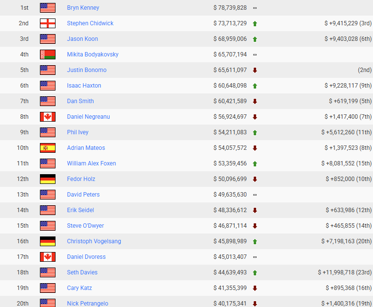 Ο Bryn Kenney εξακολουθεί να βρίσκεται στην κορυφή της παγκόσμιας λίστας κερδών από τουρνουά πόκερ, με συνολικά έσοδα που αγγίζουν τα 78.739.828 δολάρια. Ο Αμερικανός επαγγελματίας έχει διατηρήσει την πρωτιά του χάρη σε μερικές τεράστιες επιτυχίες, με κορυφαία το Triton Million for Charity του 2019, όπου τερμάτισε δεύτερος και εισέπραξε πάνω από 20,5 εκατομμύρια δολάρια.