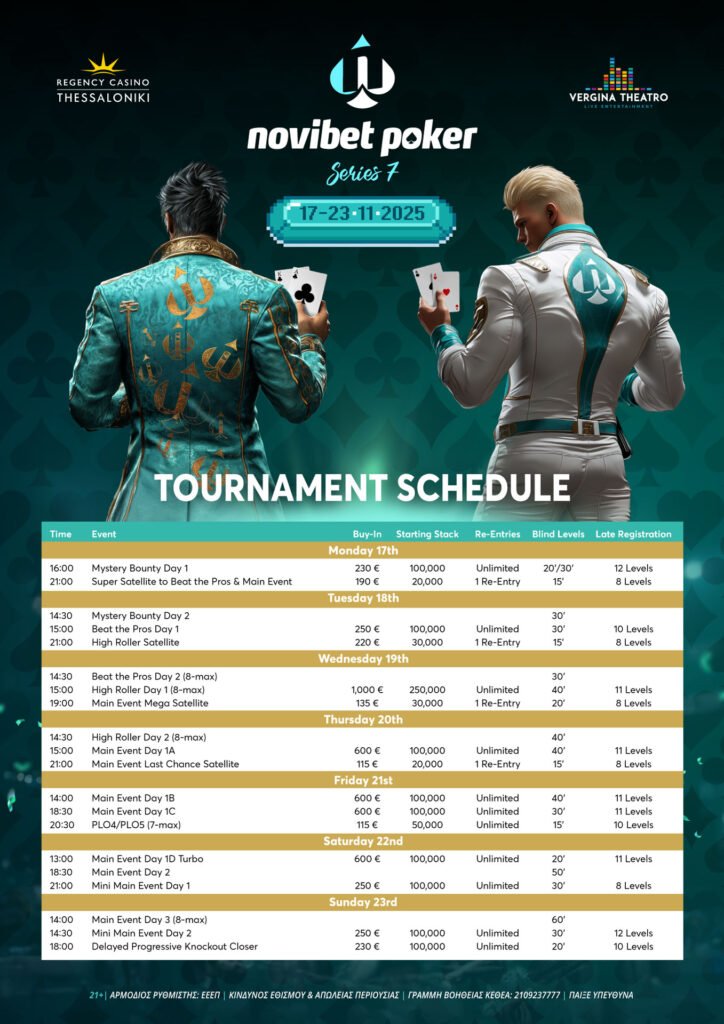 Το πολυαναμενόμενο Novibet Poker Series #7 κάνει πρεμιέρα αύριο, 17 Νοεμβρίου, στο Regency Casino Thessaloniki και υπόσχεται μία ολόκληρη εβδομάδα γεμάτη δυνατές μάχες στα τραπέζια και μεγάλα έπαθλα. Το φεστιβάλ θα φιλοξενηθεί στο επιβλητικό Vergina Theatro και θα διαρκέσει έως τις 23 Νοεμβρίου.