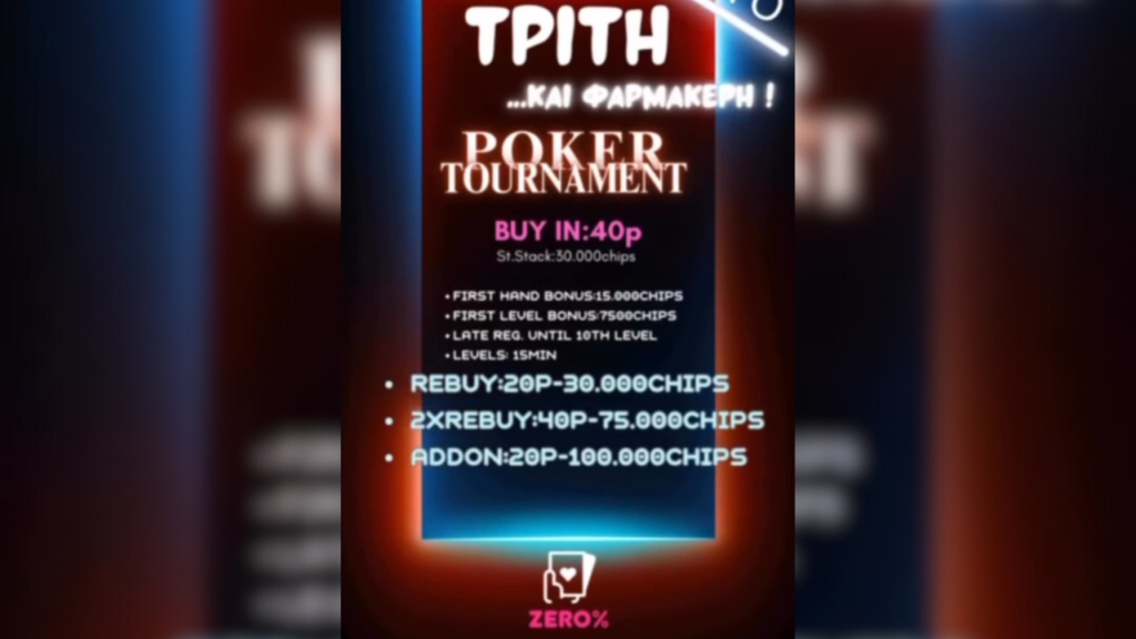 Σήμερα στις 18:00 το ZERO% στην Καρδίτσα φιλοξενεί ένα ακόμη δυνατό Τουρνουά Πόκερ, στο πλαίσιο της καθιερωμένης «Τρίτης… και φαρμακερής». Το τουρνουά ξεχωρίζει για τη δομή του και τα γενναιόδωρα bonus που προσφέρει στους συμμετέχοντες.